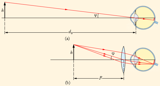 Для невооруженного глаза наименьший угол зрения приблизительно равен 1'. Этот угол определяется мозаичным строением сетчатки, а также волновыми свойствами света. Существует ряд приборов, предназначенных для увеличения угла зрения – лупа, микроскоп, зрительная труба. При визуальных наблюдениях глаз является неотъемлемой частью оптической системы, поэтому ход лучей в приборах, вооружающих глаз, зависит от аккомодации глаза. При анализе работы оптических приборов для визуальных наблюдений удобнее всего полагать, что глаз наблюдателя аккомодирован на бесконечность. Это означает, что лучи от каждой точки предмета, пройдя через прибор, попадают в глаз в виде параллельного пучка. В этих условиях понятие линейного увеличения теряет смысл. Отношение угла зрения φ при наблюдении предмета через оптический прибор к углу зрения ψ при наблюдении невооруженным глазом называется угловым увеличением: