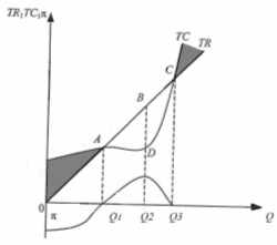 Якщо маємо графічну форму - криві TR і ТС (рис.2.2 (9, с.152.)), тоді прибуток для будь-якого значення Q графічно визначається як різниця вертикальних координат цих кривих. У підсумку отримаємо криву прибутку π. При обсягах виробництва до Q1 фірма матиме збитки, при обсягах виробництва від Q1 до Q3 - прибуток. Максимальний прибуток досягається при Q2, а при обсягах виробництва понад Q3 фірма знову матиме збиток. Отже, обсяг виробництва, при якому досягається максимальний прибуток, визначається максимальною різницею між TR і ТС.