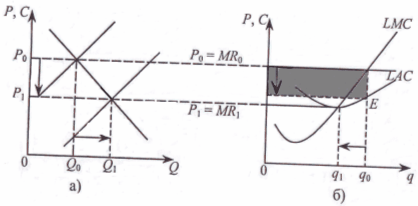 У короткостроковому періоді фірма вибере обсяг виробництва q0. Прибуток фірми при витратах LAC являє собою площу тонованого прямокутника. Наявність абсолютної інформації, повної мобільності фірм, відсутність бар'єрів для входу приведе до того, що фірми інших галузей, притягнуті цим прибутком, намагатимуться розпочати виробництво даного продукту. В результаті ціна зменшиться до Р1 і дорівнюватиме мінімуму LAC.