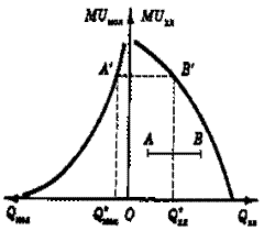 Взаимосвязь между предельной полезностью хлеба и молока.В первом квадранте изображен график предельной полезности хлеба, во втором - молока. При этом единицы измерения натуральных количеств обоих продуктов выбраны таким образом, чтобы в единицу времени можно было потребить либо единицу хлеба, либо единицу молока. Отрезок АВ представляет количество времени, которым располагает субъект для потребления выбранных продуктов питания. Чтобы определить равновесную структуру потребления, потребителю достаточно поднять "планку" АВ (сохраняя ее горизонтальное положение) до "упора", чтобы она заняла положение A`B`. Проекции точек "упора" на ось абсцисс укажут искомый набор потребляемых благ: Qхл*, Qмол*.