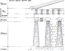 Главный элемент любого ордера – это колонна с венчающей капителью. На колоннах лежит антаблемент – перекрытие. Антаблемент делится на три части – архитрав, фриз и карниз. Архитрав – это нижняя балка, лежащая на колоннах. Над архитравом идет фриз, состоящий из триглифов и метоп. Триглиф – это каменная дощечка с вертикальными вырезами, метопа – плита из керамики, украшенная барельефами. Над фризой выступает карниз. Двускатная крыша, покрытая черепицей на переднем и заднем фасадах, образовывала треугольники, так называемые фронтоны, они обычно заполнялись скульптурой. Каменное основание храма было трехступенчатым, оно называется стилобат.