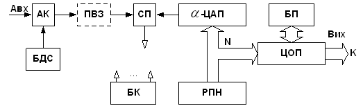 Слід зазначити, що використання АЦП із ЦАП на основі НПСЧ у складі систем цифрової обробки аналогових сигналів також дає певні переваги перед двійковими перетворювачами інформації. Так, зменшений час врівноважування дозволяє підняти частоту дискретизації, збільшити кількість оброблюваних каналів при роботі в багатоканальному режимі. Незважаючи на спрощену технологію виготовлення аналогових вузлів, результуюча точність перетворення як ЦАП, так і АЦП на основі НПСЧ може бути досить високою при роздільності не менше 14-16 двійкових розрядів. Це досягається, зокрема, калібруванням ваг розрядів і корекцією статичних похибок, що здійснюється цифровим обчислювальним пристроєм. Причому даний пристрій може одночасно виконувати дві функції: калібрування похибок і перетворення НПСЧ у двійкову систему. Для виконання операцій безпосередньо з цифровими сигналами доцільно використовувати мікроконтролер. СП, a-ЦАП, РПН і БК сукупно складають ядро АЦП – блок порозрядного врівноважування (БПВ). У БК передбачено можливість подачі сигналу керування Узв.