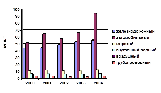 За период 2000-2004 г., объем грузов, перевезенных автомобильным транспортом в регионе, вырос на 81,1%, железнодорожным - 27,3 % (рис.4.1). Эти же два вида транспорта обеспечили максимальные темпы прироста грузооборота за рассматриваемый период: наибольший рост грузооборота был зафиксирован на автомобильном (54,6%) и железнодорожном транспорте (42,6%).