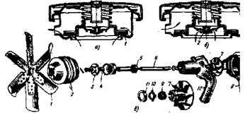 а - открыт паровой клапан 1, б открыт воздушный клапан 2, в — вентилятор и центробежный насос системы охлаждения двигателя ЗИЛ-130; 1—лопасть вентилятора, 2 — шкив, 3 —ступица шкива вентилятора, 4 —втулка шкива, 5 —подшипник, б —вал насоса, 7 —крыльчатка, в —корпус насоса, в — резиновый уплотнитель сальника, 10 —текстолитовая шайба, 1I —обойма сальника, 12—подводящий патрубок.