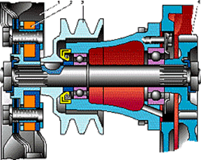 Электромагнитное сцепление (рис. 4) автоматически включает вентилятор по достижении определенной температуры охлаждающей жидкости.