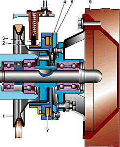 | Рис. 4. Электромагнитная муфта включения вентилятора: 1 – шкив; 2 – контактное кольцо; 3 – угольная щетка; 4 – стальное кольцо; 5 – плоская пружина; 6 – вентилятор; 7 – электромагнит. |