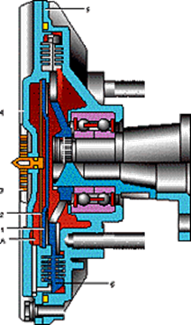 | Рис. 5. Вискомуфта вентилятора: 1 – крышка камеры; 2 – лепестковый клапан; 3 – биметаллический терморегулятор; 4 – крышка муфты; 5 – корпус муфты; 6 – ведущий диск; А – резервная полость. |