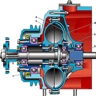 | Рис. 6. Гидромуфта привода вентилятора: 1 – шкив; 2 – ступица вентилятора; 3 – ведущее колесо гидромуфты; 4 – ведомое колесо гидромуфты; 5 – трубки подачи масла в рабочую полость; 6 – ведущий вал; А – рабочая полость. |