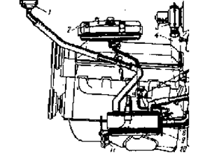 предназначенный для компенсации изменений объема жидкости, происходящих при работе двигателя. Впускной и выпускной клапаны размещаются в пробке этого бачка. На бачке имеется кран для контроля уровня антифриза Тосол-А40 или Тосол-А65, которым заправляется система охлаждения. В связи с использованием антифриза вместо сливных краников установлены резьбовые конические пробки.