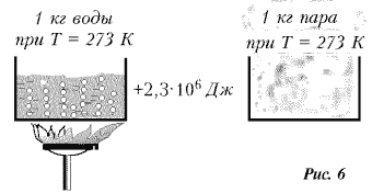 фазе. При таянии льда его температура остается равной 0 °С; такую же температуру имеет и образующаяся при таянии вода. Следовательно, чтобы перевести вещество из твердого состояния в жидкое, нужно увеличить энергию взаимодействия его частиц. Чтобы растопить 1 кг уже начавшего таять льда, нужно затратить 3,3 105 Дж энергии (рис. 7). Практически вся эта энергия идет на увеличение энергии связи частиц при их переходе изо льда в воду. Поделив энергию