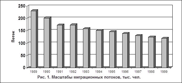 1. Масштабы миграционных процессов сокращаются. Если в 1970 г. в Ставропольском крае было зарегистрировано 304,6 тыс. мигрантов и на протяжении семидесятых годов наблюдался стабильный рост их количества (в 1975 г. – 341,5 тыс.), то уже в начале восьмидесятых отмечено некоторое сокращение миграционного потока: в 1980 г. в миграции на Ставрополье было задействовано всего 293 тыс. человек, а наиболее интенсивно снижение количества мигрантов отмечено с 1989 г., времени проявления первых симптомов обострения социально-экономической ситуации в стране (диагр. 1). В 1989 г. на Ставрополье было зарегистрировано 230,6 тыс. мигрантов. За 1991‑93 гг. сокращение составило 30 %, а общее количество мигрантов сократилось до 157,7 тыс. человек. В последующие годы их число постоянно сокращалось, достигнув минимума в 1998 г. – 123,8 тыс. человек, т.е. сократилось в 1,86 раза по сравнению с 1989 г. (табл. 1). Таким образом, сокращение масштабов миграции на Ставрополье проходит в унисон с общероссийскими тенденциями.