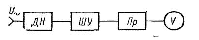 Вольтметр средневыпрямленного значения (рис. 2.3.) состоит из входного делителя напряжения ДН, широкополосного транзисторного усилителя ШУ, выпрямительного преобразователя Пр и магнитоэлектрического индикатора.