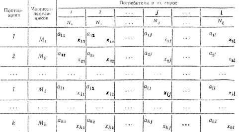 Обычно начальные условия таких задач записывают в таблицу. Например, для k поставщиков и l потребителей такая задача имеет следующий вид: