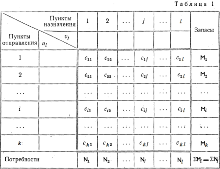 Число переменных xij, входящих в целевую функцию и в систему уравнений (1), равно произведению kl, т.е. числу клеток таблицы.