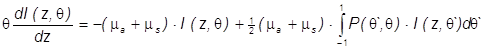 де I (z, q) – потужність випромінювання, що розповсюджується на глибині z через одиничний майданчик і в одиничному тілесному куті в напрямку, який складає з нормаллю до цього майданчика кут, конус якого рівний q, Вт×м-2×стер-1; mа тa ms – коефіцієнти поглинання і розсіювання, м-1; Р ((q', q) – фазова функція розсіювання, що описує вірогідність того, що світло розповсюджується в напрямку q.
