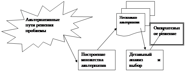 Альтернатива – это один из возможных способов достижения цели или один из конечных вариантов решений. Альтернативы отличаются друг от друга последовательностью и приемами использования активных ресурсов. Для любой задачи принятия решений должна существовать тройка: цель, критерии, альтернативы. Если отсутствует один из компонентов, то проблема не поставлена. При наличии менее двух альтернатив, отсутствует выбор.