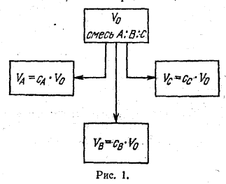 Рассмотрим для определенности смесь трех компонент А, В и С. Объем смеси V0 складывается из объемов чистых компонент: