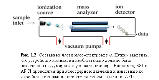 ции, анализатор массы и детектор ионов. Некоторые приборы комбинируют ввод образца и ионизацию, в других объединены анализатор массы и детектор. Однако все молекулы образца претерпевают одинаковые воздействия независимо от конфигурации прибора. Молекулы образца вводятся через систему впуска. Попав внутрь прибора, молекулы преобразуются в ионы в устройстве ионизации, а затем электростатически переносятся в анализатор массы. Ионы затем разделяются соответственно их m/z. Детектор преобразует энергию ионов в электрические сигналы, которые затем поступают в компьютер.
