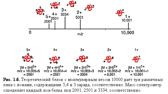Многократная зарядка: белок с массой 10000 дальтон и его теоретический масс-спектр с зарядами до +5 показаны на рис. 1.8. Масса белка остаётся такой же в то время, как отношение m/z меняется в зависимости от числа зарядов на белке. Ионизация белка есть обычно результат протонирования, что не только добавляет заряд, но также увеличивает массу белка на число добавленных протонов. Это действие на m/zприменимо одинаково для любого механизма ионизации молекулы, образовавшего положительно или отрицательно заряженный молекулярный ион, включая присоединение или отрыв несущих заряд частиц, отличных от протона (например, Na+ и Cs+). Многократные положительные заряды наблюдаются для белков, в то время как для олигонуклеотидов типично образование отрицательных зарядов (с ESI).