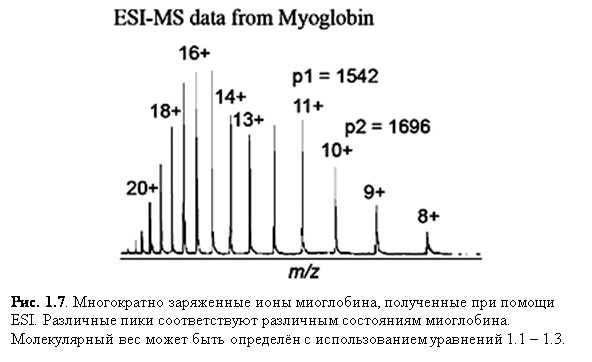 Ионизация электроспрея благоприятствует образованию единично заряженных малых молекул, но также хорошо известно образование в ходе неё многократно заряженных экземпляров больших молекул. Это важное явление, т.к. масс-спектрометр измеряет отношение массы к заряду (m/z) и поэтому многократная зарядка делает возможным наблюдать очень большие молекулы при помощи инструмента с относительно малым диапазоном масс. К счастью, программы, пригодные для всех масс-спектрометров с электроспреем, позволяют произвести вычисления молекулярной массы, необходимые для определения действительной массы многозарядных образцов. Рис. 1.6 и 1.7 показывают различные заряженные состояния двух различных белков, где каждый пик в масс-спектрах может быть соотнесён с различными зарядовыми состояниями молекулярного иона. Многократная зарядка имеет другие важные преимущества в тандемной масс-спектрометрии. Одно из преимуществ состоит в том, что после фрагментации вы наблюдаете больше фрагментарных ионов от многозарядного предшественника, чем от однозарядного.