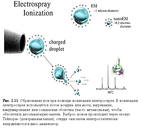 Вплоть до 1980-х электронная ионизация (EI) была основным способом ионизации для анализа масс. Однако EI ограничивала химиков и биохимиков малыми молекулами, масса которых намного ниже массы большинства биоорганических соединений. Это ограничений побудило таких учёных, как Дж. Б. Фенн, К. Танака, Ф. Хилленкамп, М. Карас, Г. Кукс и М. Барбер, разработать новое поколение способов ионизации, включая бомбардировку быстрыми атомами/ионами (FAB), лазерную ионизацию при помощи матрицы (MALDI) и ионизацию электроспрея (таблица 1.2). Эти способы совершили революцию в биомолекулярном анализе, особенно для больших молекул. Среди них, ESI и MALDI стали по-настоящему «избранными», когда дело касается биомолекулярного анализа.