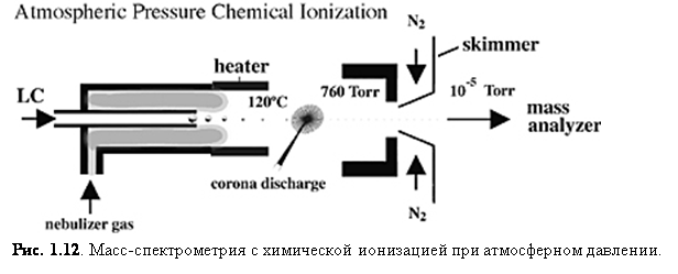 APCI также стала важным способом ионизации, потому что она генерирует ионы непосредственно из раствора и способна к анализу относительно неполярных соединений. Так же, как и в электроспрее, поток жидкости для APCI (рис. 1.12) вытекает непосредственно в устройство ионизации.