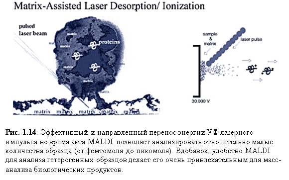Хотя точный механизм десорбции/ионизации для MALDI неизвестен, принято считать, что MALDI вызывает ионизацию и перевод образца из конденсированной фазы в газовую посредством лазерного возбуждения и индивидуализации молекул образца из матрицы (рис. 1.14). В MALDI анализе аналит сначала сокристаллизуется с большим молярным избытком матричного соединения, обычно УФ-поглощающей слабой органической кислотой. Облучение такой смеси аналита с матрицей лазером приводит к испарению матрицы, которая несёт аналит в себе. Матрица играет ключевую роль в этом методе. Сокристаллизованные молекулы образца также испаряются, но без прямого поглощения энергии лазера. Молекулы, чувствительные к лазерному излучению, поэтому защищены от прямого возбуждения УФ-лазером.