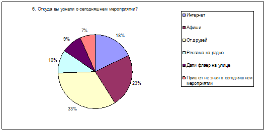 С помощью этого вопроса мне удалось выяснить три самых эффективных рекламных метода. Безусловно, важнейшей является информация, полученная от друзей. Такой метод является самым дешевым, но и в то же время самым трудоемким. Сделать так, чтобы среди молодежи ходили разговоры, о каком то конкретном мероприятии, весьма непросто. Так же вполне оправдали себя затраты на афиши и рекламу в Интернете.