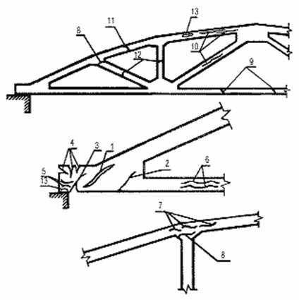 Трещины опорного узла ферм по своей природе близки к трещинам на опорах балок. Появление горизонтальных трещин в нижнем напряженном поясе 6 свидетельствует об отсутствии или недостаточности поперечного армирования в обжатом бетоне. Нормальные (перпендикулярные к продольной оси) трещины типа 9 появляются в растянутых стержнях при необеспеченности трещиностойкости элементов.