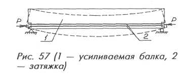 Продольные затяжки в виде арматурных стержней или прокатных профилей располагают вдоль растянутой грани ферм (балок) и закрепляют на торцах. Под воздействием внешней нагрузки балка прогибается, а ее опорные сечения (торцы) поворачиваются (рис. 3). При повороте торцы увлекают за собой затяжку, удлиняют ее и вызывают в ней растягивающее усилие, которое, в свою очередь, действует на балку в виде сжимающей силы Р. От этой силы в балке возникает разгружающий момент Мp=-Ре, где е — расстояние от силы Р до центра тяжести сечения. В отличие от усиления шпренгелем, поперечные силы здесь не уменьшаются и разгружение опорных участков (наклонных сечений) не происходит.