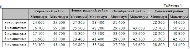 Средние цены за 1кв.м. жилой недвижимости в разных районах г.Томска находятся в диапазонах, представленных в таблице 1: