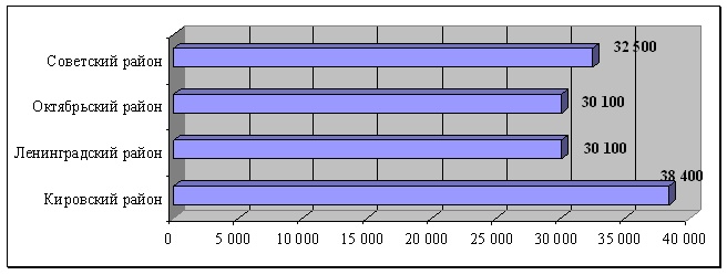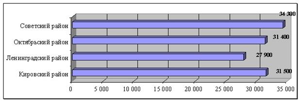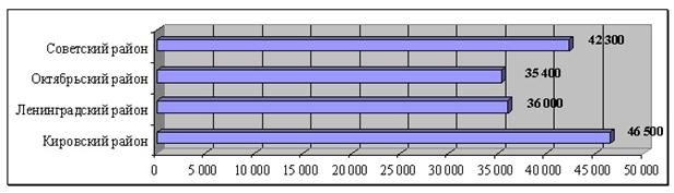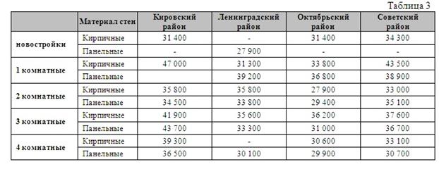 Самая высокая стоимость одного квадратного метра двухкомнатных квартир наблюдается в Кировском районе 38 100руб./кв.м., далее по убывающей можно расположить Ленинградский, Советский и Октябрьский районы, средневзвешенная стоимость квадратного метра в этих районах колеблется от 35 200руб./кв.м. до 29 800руб./кв.м.