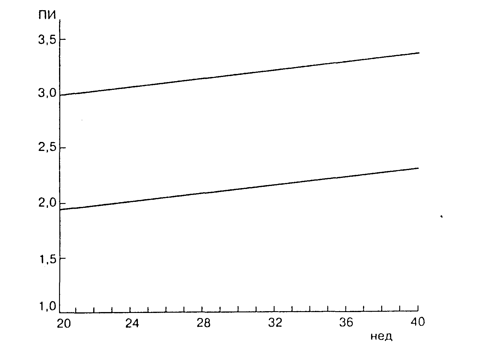 Значения показателей кровотока в артерии пуповины в 3 триместре беременности:
