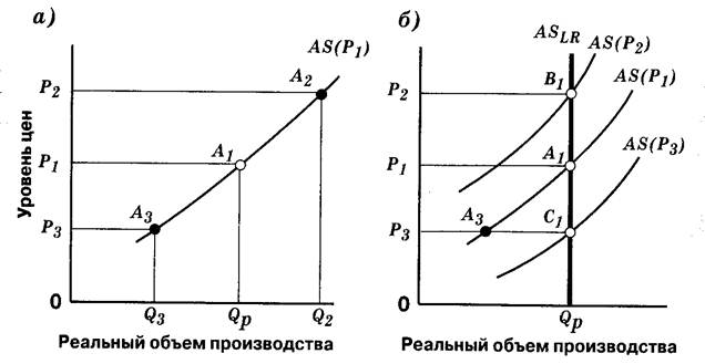 Рис. 4. Совокупное предложение в краткосрочном и долгосрочном плане: а — совокупное предложение в краткосрочном плане; б — совокупное предложение в долгосрочном плане