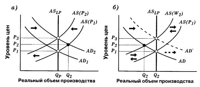 Рис. 5 Инфляция спроса и издержек: а — инфляция, вызванная избыточным спросом: б— инфляция, вызванная ростом издержек