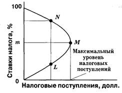 Основная идея заключается здесь в том, что по мере роста ставки налога от нуля до 100% налоговые поступления будут расти от нуля до некоторого максимального уровня (М), а затем снижаться до нуля.