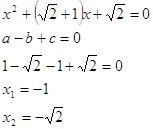 4. Если b<0, c<0 то уравнение имеет корни разных знаков, причём отрицательный корень по абсолютной величине меньше положительного.