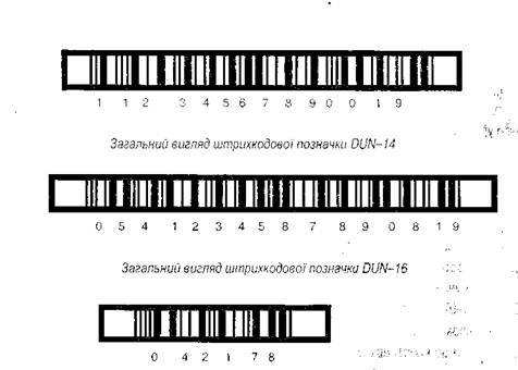 Штрихкодовые отметки DUN 14, DUN - 16 та ДК имеют одинаковую структуру и отличаются только количеством информационных знаков соответственно 14, 16 и 6. Для изображения этих отметок применяется штриховой код ITF. Структура штрихкодовой отметки, которая была сформирована представлением кода EAN - 13 единицы поставки штриховым кодом ITF, аналогична структуре штриховой отметки DUN - 14. В этом случае перед 13 цифрами кода EAN -13 должна стоять цифра "0".