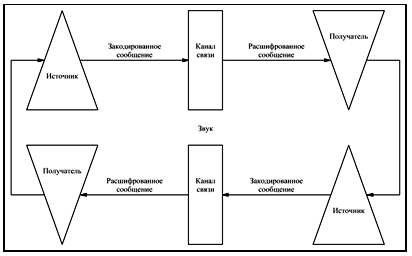 Коммуникация как действие ее модель представлена на рис. 2. В этой модели источник коммуникации разрабатывает послание, состоящее из символов. Символы затем превращаются в сигналы, или кодируются. Сигналы посылаются через каналы для получателя информации, который их расшифровывает или интерпретирует. Модель также включает звук, который влияет на процесс. Модель, представленная на рис. 2, первоначально применялась к электронной коммуникации, однако использовалась также для описания коммуникации между людьми. Коммуникация рассматривалась как односторонний процесс. В этой модели нет места для обратной связи.