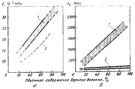 Рис.6. Зависимость модуля упругости Е (а) и временного сопротивления σВ (б) бороалюминиевого композиционного материала вдоль (1)