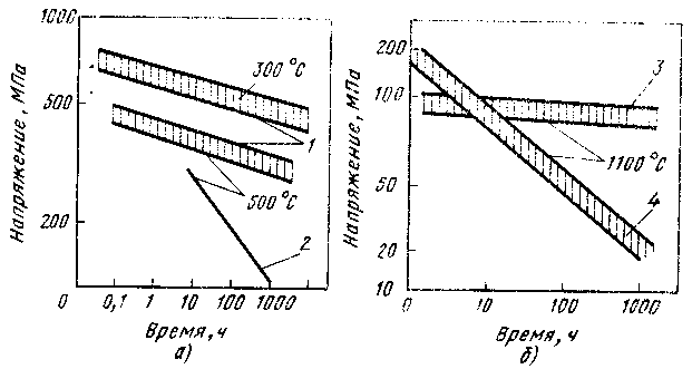 Рис.7. Длительная прочность бороалюминиевого композиционного материала, содержащего 50% борного волокна, в сравнении с прочностью титановых сплавов (а) и длительная прочность никелевого композиционного материала в сравнении с прочностью дисперсионно-твердеющих сплавов (б)