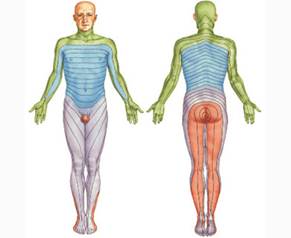 Рис.1.2 Схема сегментарной иннервации на поверхности тела человека помогает в уточнении локализации невритов и полиневритов.