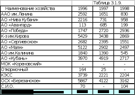 Наименование хозяйства | 1996 | 1997 | 1998 |