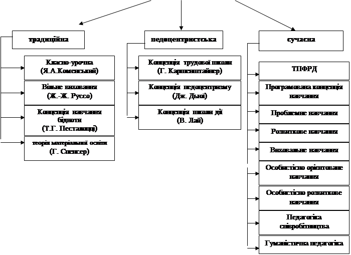 Отже ми можемо виділити три класичні групи концепцій навчання: традиційна, педоцентристська, сучасна*.
