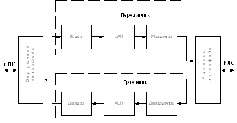 Поскольку каждый абонент системы передачи данных является как источником, так и получателем информации, то на каждом ПК необходимо организовать передающую и приемную части системы. Это удобно организовать, используя для передатчика и приемника один внутренний и внешний интерфейсы. Таким образом, обобщеная структурная схема системы передачи данных на одном ПК будет иметь следующий вид (рис. 3.1).
