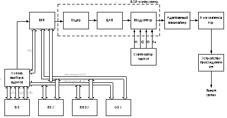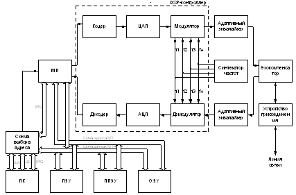 Процессы кодирования, декодирования, цифро-аналогового и аналого-цифрового преобразования, а так же модуляции и демодуляции выполняются микропроцессорной системой. Эта система имеет в своем составе постоянное запоминающее устройство (ПЗУ), которое содержит программное обеспечение, обеспечивающее выполнение определенных функций микропроцессорной системы. Так же в нее входят оперативное запоминающее устройство (ОЗУ) и перепрограммируемое постоянное запоминающее устройство (ППЗУ). ОЗУ используется для хранения промежуточных результатов вычислений, ключевых данных. В ППЗУ заносятся временные алгоритмы работы микропроцессорной системы. Все преобразования, которым подвергается сигнал, выполняются в самом микропроцессоре (МП). К используемому микропроцессору предъявляются особые требования. Так как при реализации алгоритмов кодирования и декодирования основной математической операцией является умножение с плавающей запятой, то при использовании классических МП резко возрастает сложность написания программ и время их выполнения. Сегодня в цифровой обработке сигналов широко применяются цифровые сигнальные процессоры, называемые еще – DSP-контроллерами. Основное достоинство этих DSP-контроллеров - возможность выполнения однотактных умножений, сложений, наличие специфических команд, таких как двоичная инверсия. Использование такого DSP-контроллера резко снижает требования к его быстродействию, что положительно сказывается на цене системы. Используя в микропроцессорной системе, наряду с обычным микропроцессором, DSP-контроллер, можно перераспределить выполняемые функции. Так МП занимается организацией обмена данными по шине данных с ПК, генерируя и получая адресную информацию по шине адреса, то есть выполняет функции внутреннего интерфейса. Так как быстродействие DSP-контроллера на много выше МП, то он выполняет функции кодирования, декодирования, цифро-аналогового и аналого-цифрового преобразования, а так же модуляции и демодуляции.