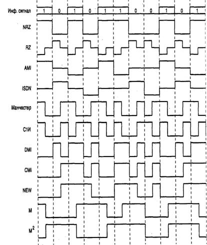 Перечисленные проблемы решаются при помощи линейного кодирования. Параметры получаемого линейного сигнала должны быть согласованы с характеристикой, используемой линии, и отвечать ряду следующих требований. Энергетический спектр линейного сигнала должен быть как можно уже. В нем должна отсутствовать постоянная составляющая, что позволяет повысить верность либо дальность передачи. Структура линейного сигнала должна обеспечивать возможность выделения тактовой частоты на приемной стороне. Необходимо обеспечить возможность постоянного контроля за ошибками на уровне физической линии. Линейный код должен иметь достаточно простую техническую реализацию. Примеры линейных кодов приведены на рис. 4.1 (2).