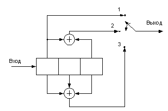 Считается, что первоначально все ячейки регистра сдвига находятся в нулевом состоянии. Допустим, что первый входной бит «1». Он без задержек появляется на выходе первой ячейки регистра и, соответственно, на всех трех входах выходного ключа (мультиплексора). Ключ поочередно выдает содержимое входов, и в результате выходная последовательность из трех бит будет – 111. Допустим, что второй входной бит «0». Он записывается в первую ячейку регистра, вытесняя предыдущий бит («1»), во вторую ячейку – и на входах мультиплексора появляются 001. Если третий входной бит 1, выходная последовательность 100 и т. д. Таким образом, в ответ на каждый входной бит (k=1) сверточный кодер откликается тремя битами, по числу функциональных генераторов (n=3).