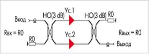 Совершенство полупроводниковой технологии и появление миниатюрных сверхширокополосных ферритовых трансформаторов (на их базе строятся направленные 3 dB ответвители - НО) с малыми потерями позволили строить широкополосные усилители с выходным каскадом, собранным по балансной схеме и выполненным по гибридной технологии. По английской терминологии схемы таких усилителей именуются push-pull. Структурная система балансного каскада показана на рис.2 (выравнивание фазовых плеч учтено в конструкции НО и на схеме не отражено).