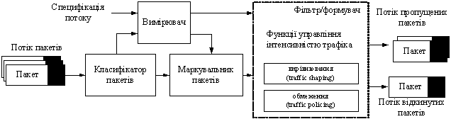 Відповідно до наведеної схеми організації управління доступом (рис. 1) потік даних, який виділено класифікатором із вхідного потоку трафіка на підставі певної ділянки заголовка пакета, направляється на вхід вимірювача. Вимірювач порівнює часові характеристики потоку з тими, що заявлено в трафік-контракті, використовуючи, наприклад, алгоритм «кошика маркерів». Надалі ця інформація подається на входи маркувальника і фільтра/формувача.